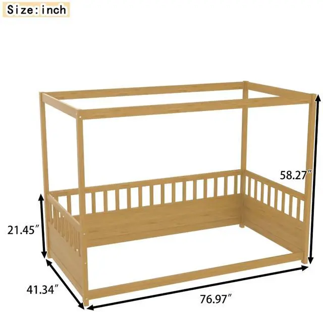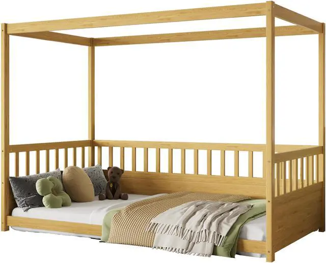 • Twin Size Canopy Bed Frame with Guardrails for Kids,Floor Bed Twin with Four Poster Design,Kids Montessori Floor Bed,Wood Canopy Bed Frame for Girls,Boys(Twin,Natural)