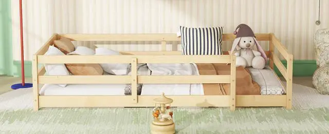 • Twin Size Floor Bed, Montessori Floor Bed with Fence, Kids Montessori Bed Twin Size, Wood Montessori Floor Bed for Kids, Girls, Boys (Natural).