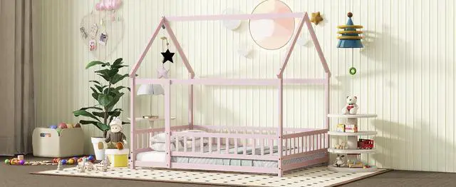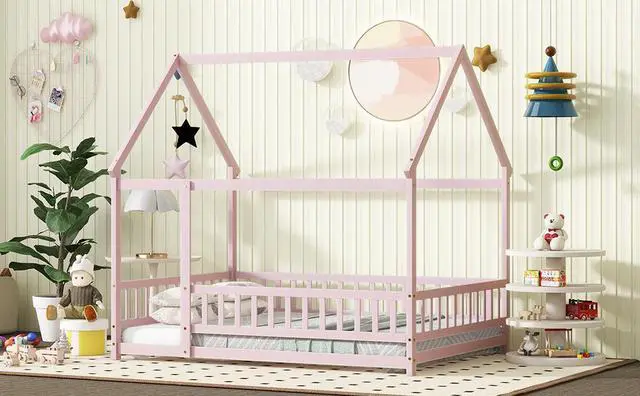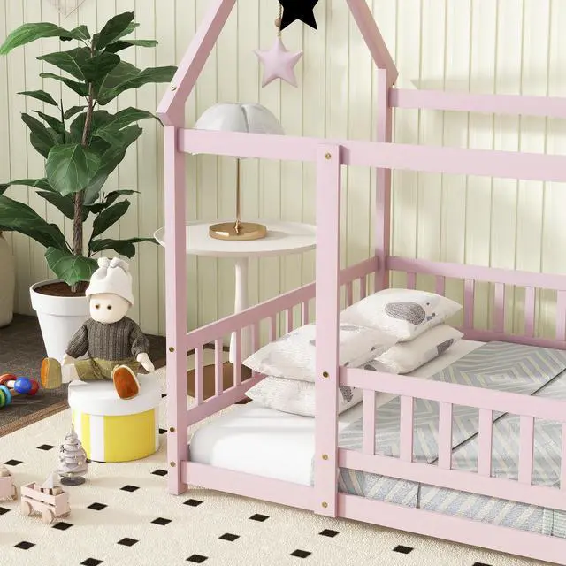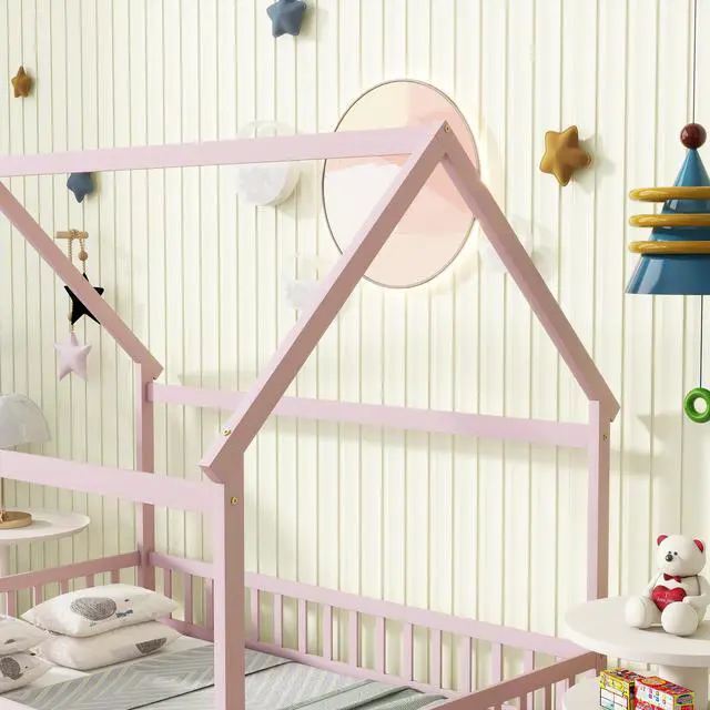 • Full Size House Floor Wooden Bed with Roof Frame, Safety Guardrails,Pink