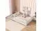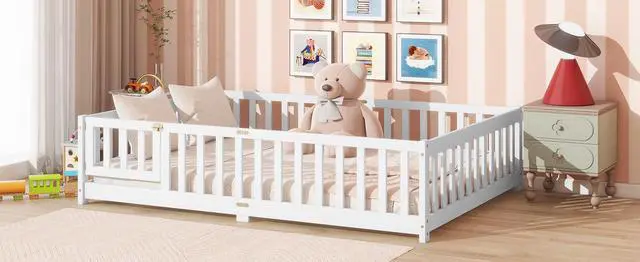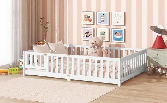 • Full Size Floor Bed with Fence and Door,Rubber Wood Floor Bed with Safety Guardrails,White
