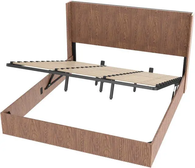 Large grooved undulating lift storage bed frame, wooden platform bed frame with lift storage, no spring box required/no noise, rustic brown slatted natural wood( King)