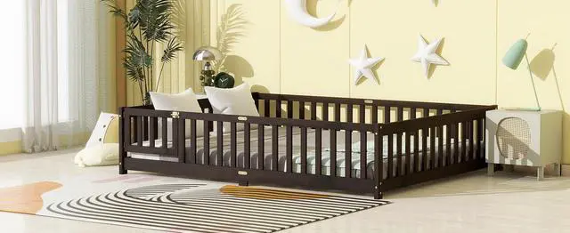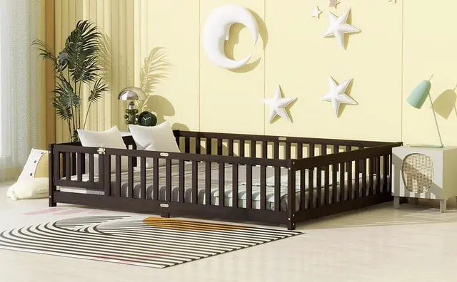 • Queen Size Floor Bed with Fence,Door,Rubber Wood Floor Bed with Safety Guardrails,Espresso