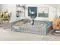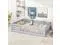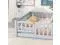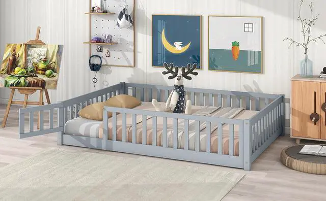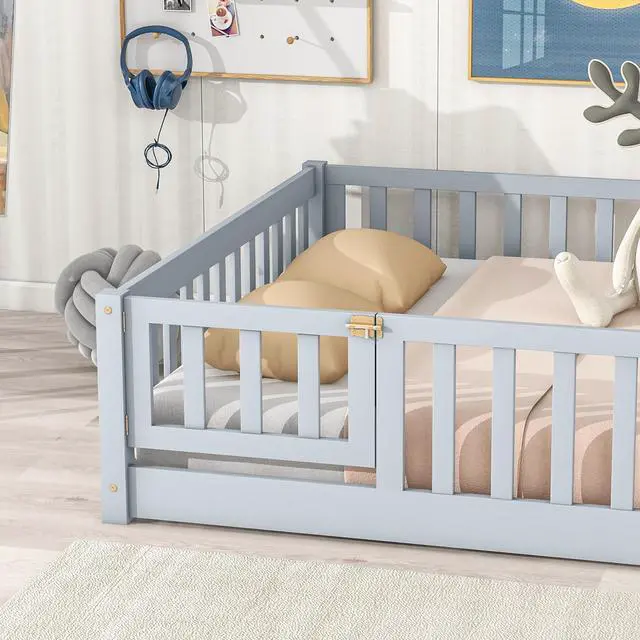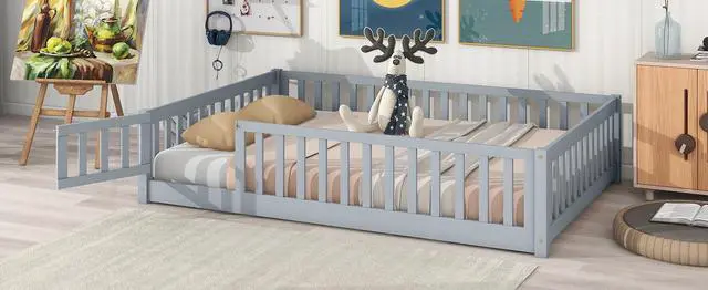 • Full Size Floor Bed with Fence and Door,Rubber Wood Floor Bed with Safety Guardrails,Grey