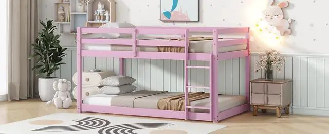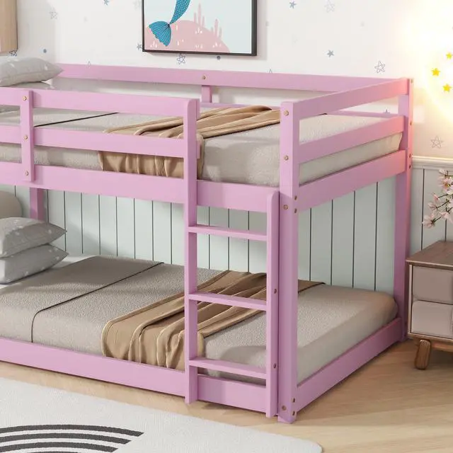 #1 [Twin over twin bed Design]The low height feature of this twin over twin floor bunk bed not only ensures better stability but also increases versatile utilization. The unique design offers diverse sleeping preference as well as optimizing storage space. The ladder is crafted with a wider width to provide more spacious steps and solid support, ensures a more convenient climbing up and down.