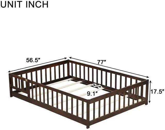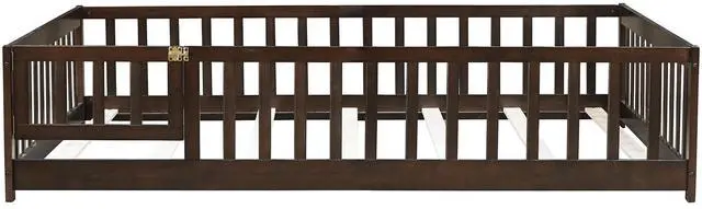 • Full Size Floor Bed with Fence and Door,Rubber Wood Floor Bed with Safety Guardrails,Espresso