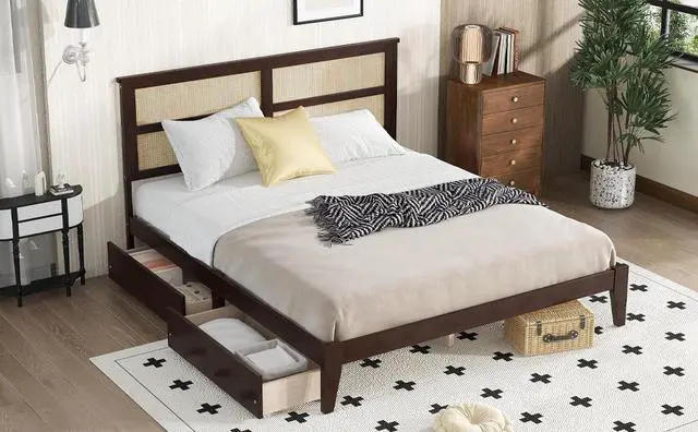 #1 [Unique Rattan Headboard]The distinctive intricately interwoven Rattan Headboard of this bed harmoniously infuse your bedroom décor with a vintage attraction and fostering a cozy yet fashionable ambiance. Moreover, the bed is an example of superior craftsmanship and long-lasting materials further elevating its overall aesthetic appeal.