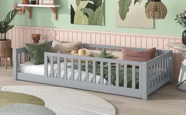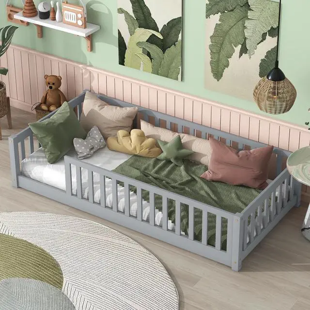 • Twin Size Floor Bed with Fence without Door, Rubber Wood Floor Bed with Safety Guardrails,Grey