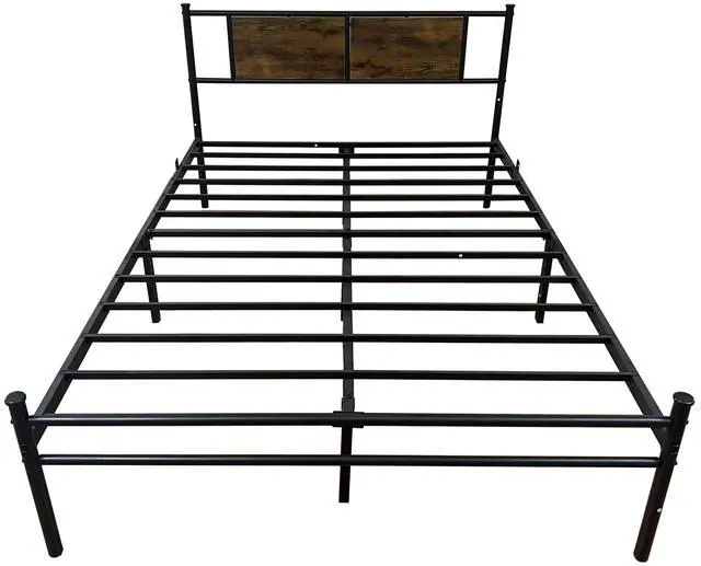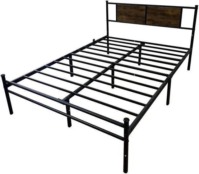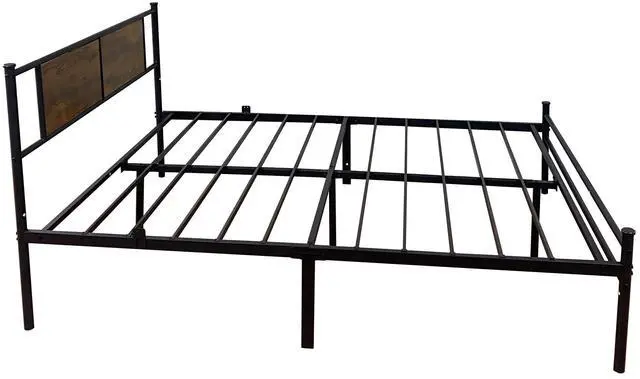 The queen bed frame features a wooden and metal line headboard with striking natural wood grain. This style seamlessly complements any home decor.