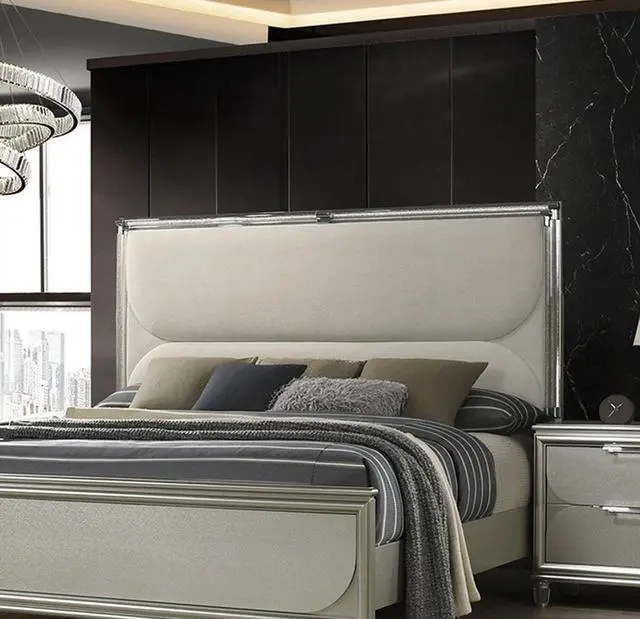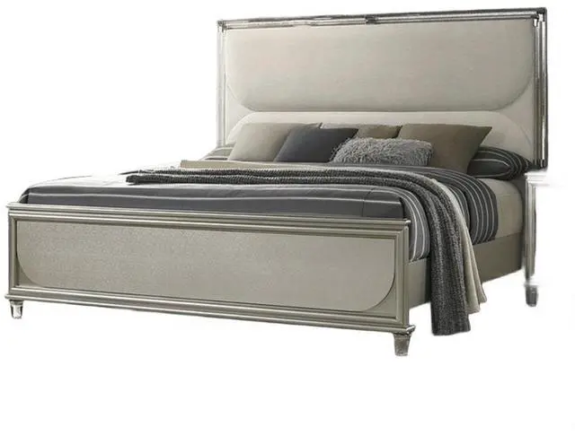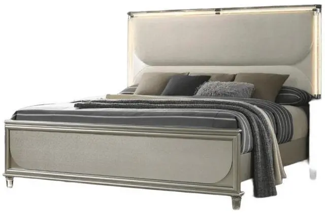 Contemporary Silver Color Fabric, Solid Rubberwood, Engineered Wood LED on Headboard and Mirror Embossed Panels Acrylic Tube W LED Light on HB 1pc Queen Size Bed Only. Mattress: NOT INCLUDED Dresser, Mirror, Nightstands And Chest - Not Included.