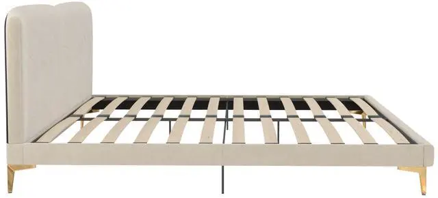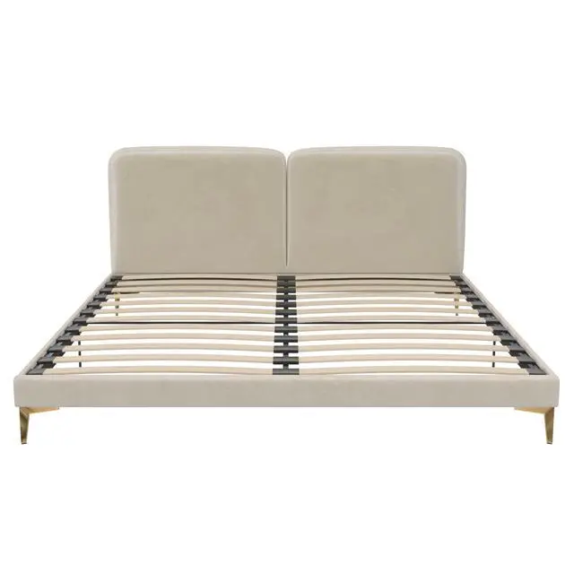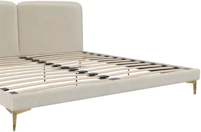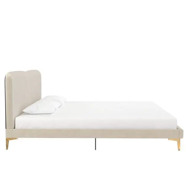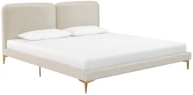 A step above the rest, this velvet upholstered platform bed will give you all the feels with its rounded dual-panel and foam-padded sweetheart headboard made for two, low-profile space saving design, and modern high-gloss metal gold-plated legs
