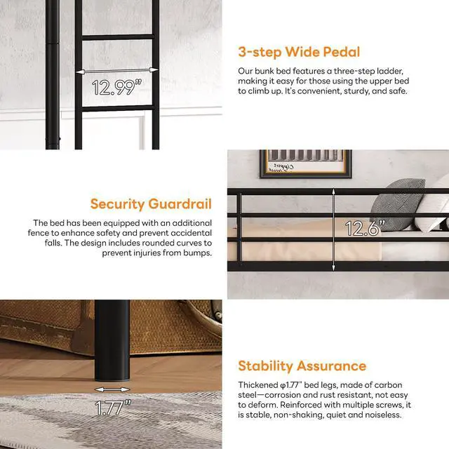 Safety Features13 inches High guardrail and built-in ladder with flat rungs ensure this kids bunk bed twin over twin security and easy climbing.