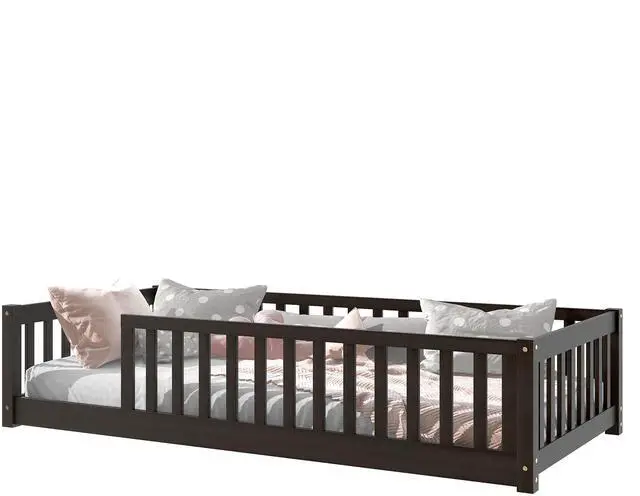 • Twin Size Floor Bed with Fence without Door, Rubber Wood Floor Bed with Safety Guardrails,Espresso