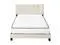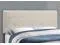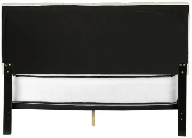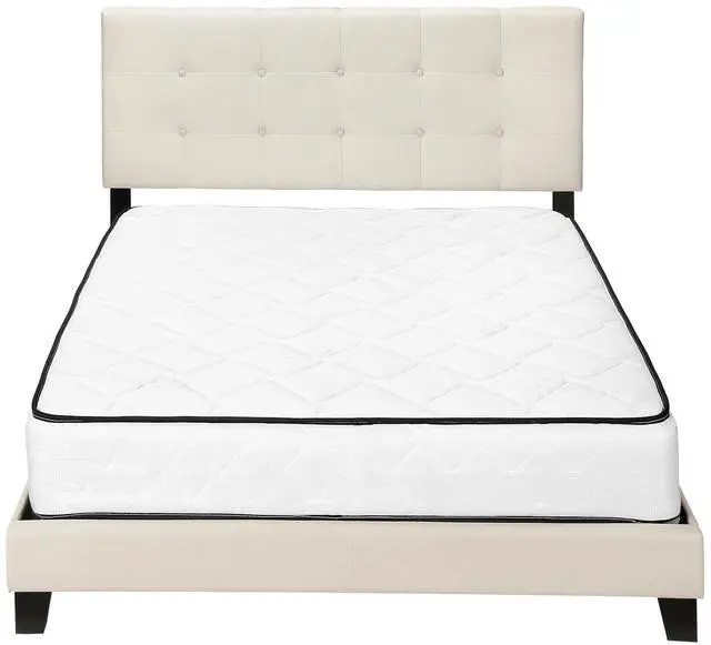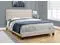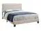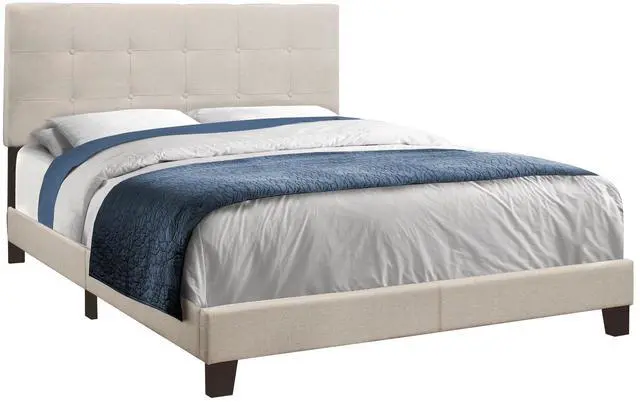 Low profile queen bed frame upholstered in a beautiful beige linen look fabric; padded headboard boasts an elegant tufted design