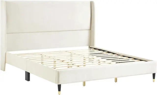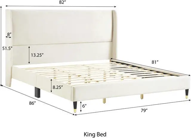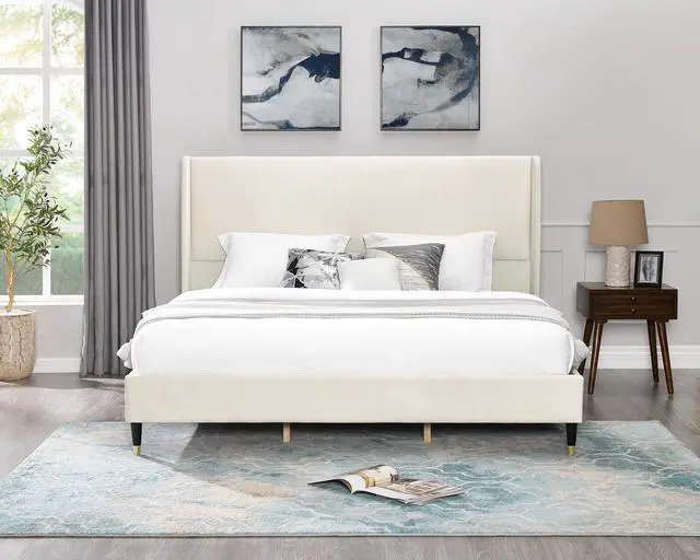 [TIMELESS DESIGN]: The headboard features a wingback design that adds a touch of timeless elegance to your bedroom, creating a sophisticated focal point that complements any decor style. Its cone-like feet feature a black-gold finish, bringing a modern and chic aesthetic to the bed and infusing your space with contemporary style. With a low-profile platform, this bed offers a sleek and minimalist look for your bedroom.