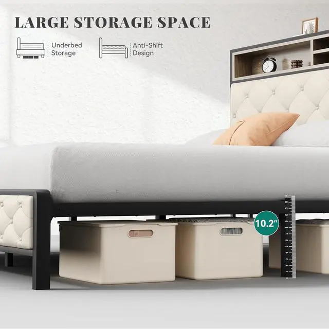 Practical Storage Headboard - The upholstered bed frame offers incredible practical function; The thickened storage headboard serves as a 2-in-1 solution while the spacious top shelf is a great place to keep your phones, clocks, glasses, and decorative items; Filled with high-density foam to create a comfortable backrest when you relax.