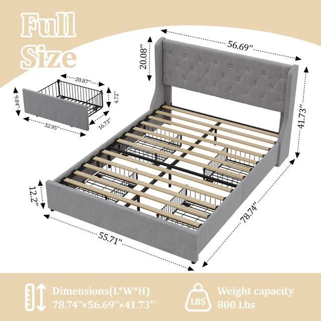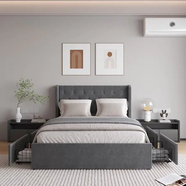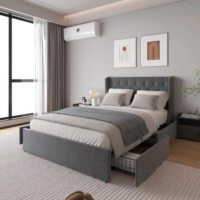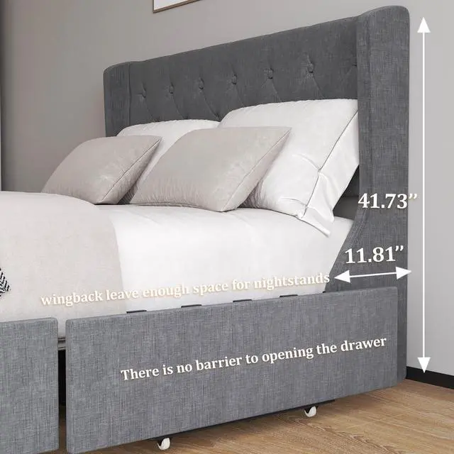 UPHOLSTERED BED WITH DRAWER: Four invisible under-bed storage drawers with wheels, still maintain a fashionable appearance, no more worry about crowded closets