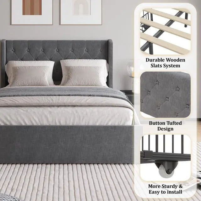 DELUXE WINGBACK BED FRAME: Wide side wingback better supports your head and shoulders when leaning on the headboard, further enhance the stability, and effectively prevents the pillow from falling