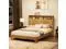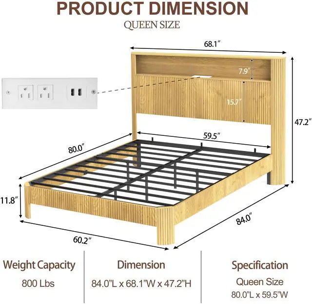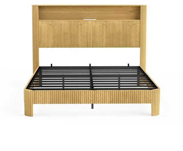 • Queen Size bed frame with storage headboard, built-in charging station, wavy curved lines design, silent operation, metal support, Natural