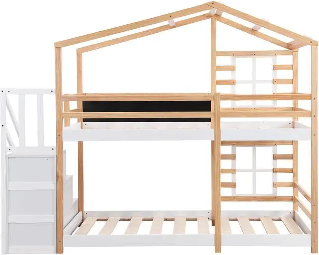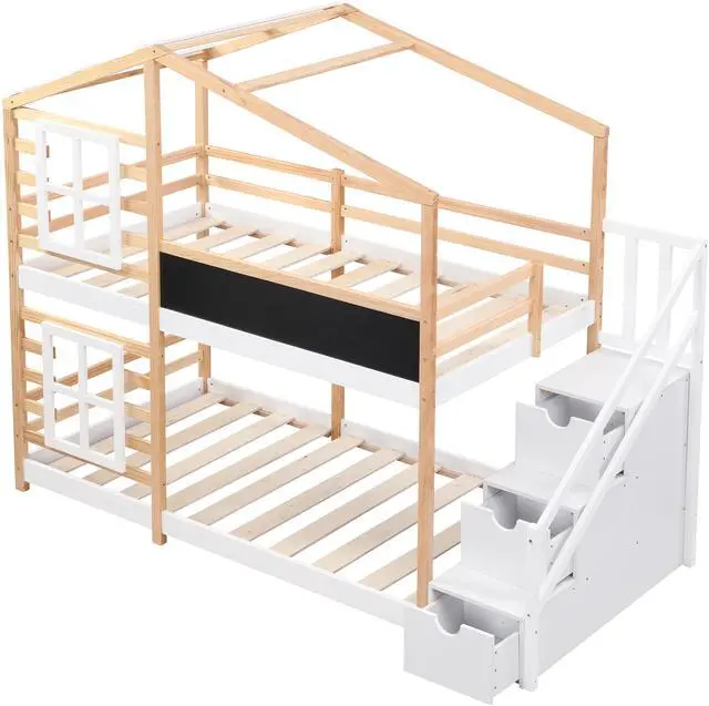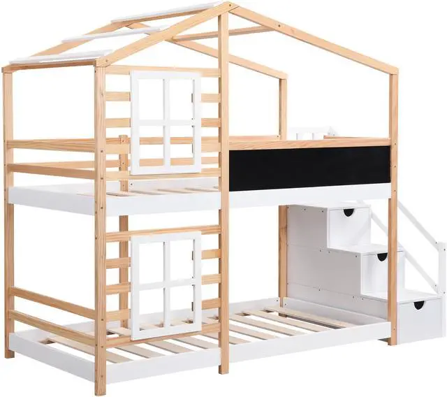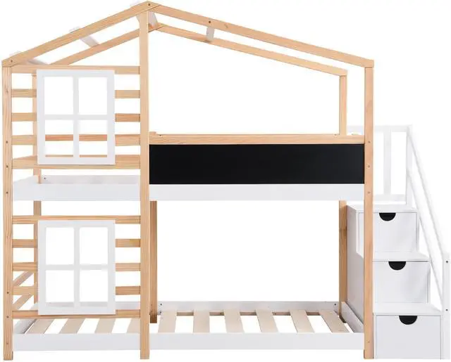 Fun & Comfortable Bunk Bed Frame This bunk bed featuring windows, blackboard, storage stairs, provides girls and boys with endless imagination and access to the natural woods, while they go to bed and fall asleep. They can put various decorations and accessories on the window boxes to accompany their whole sleep and daily activities.
