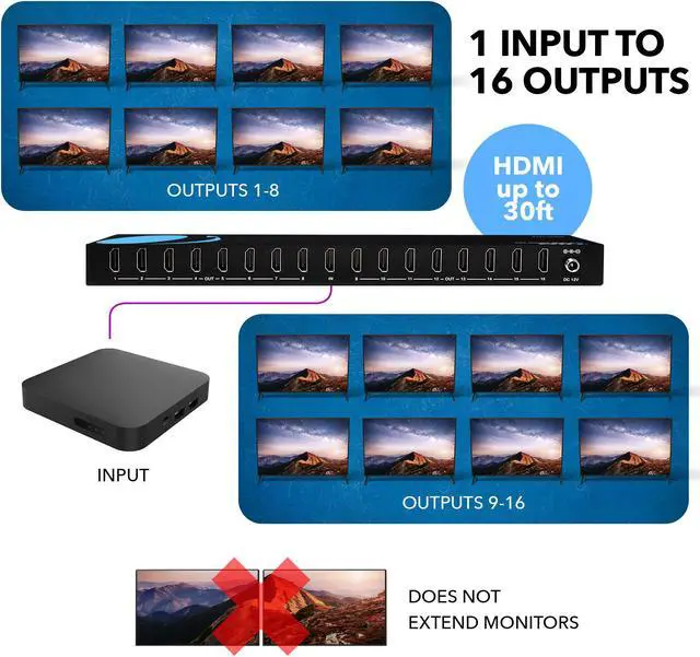 Please note that this HDMI 2.0 splitter will duplicate the source to the sixteen output displays. It can€™t be used to extend a desktop for PC or a laptop. If the connected displays do not support the same resolution then the splitter will lower the output resolution to the next best resolution supported by both displays and same goes with the audio signal. We recommend using this HDMI 2.0 splitter with high quality HDMI cables 30 feet or less.