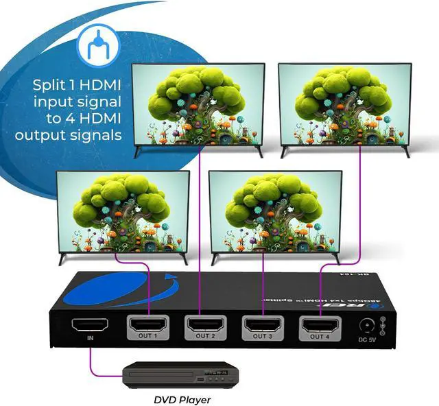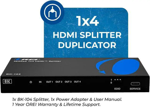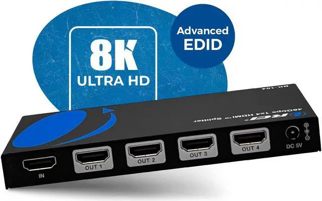 The BK-104 Splitter is an advanced solution for splitting a single HDMI signal to 4 HDMI outputs synchronously, with video resolution up to 8K@60Hz 4:2: 0 12bit. It supports data rates up to 48Gbps to comply with HDMI 2.1 and HDCP 2.3 requirements.