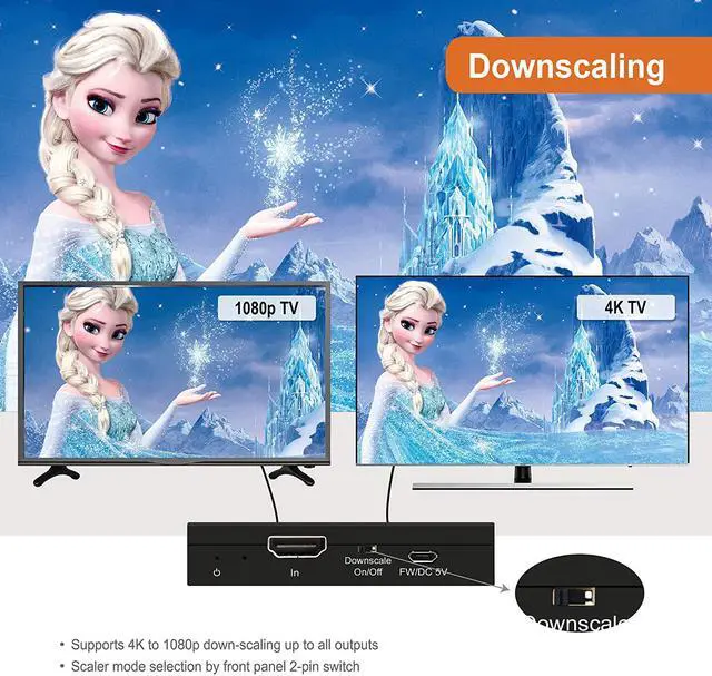 NOTE: the MRO series splitters do not downscale to 720P. They do not change the scan type (Progressive vs Interlaced) and they do not downscale HDR Metadata (HDR/HDR10/DolbyVision)