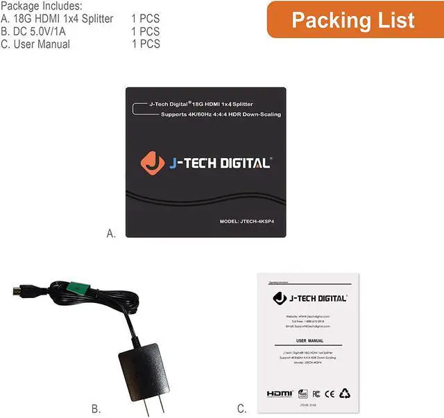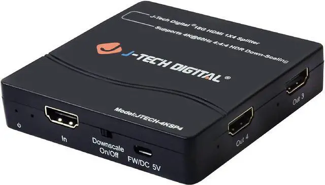 The JTECH-4KSP4 1 x 4 HDMI splitter is a Multi-Resolution Output HDMI scaler switcher that can support various UHD resolutions. This 1 x 4 HDMI splitter is perfect for users that are in the process of upgrading their entertainment centers and need a device that supports 4K and 1080p resolutions, allowing them to integrate newer, more advanced displays without having to replace their older model displays.