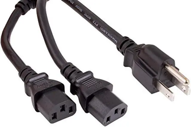 10ft 16 AWG Universal Power Cord Splitter Cable (NEMA 5-15P to IEC320 C13 x 2), Black Featuring a Nema 5-15P male connector on one end and two C13 female connectors on the other, this power cord splitter cable allows you toconnect two devices with C14 connections, such as computers, to one 5-15R power outlet. This power cord is rated for 125 volts and 13 amps of power. This heavy-duty 16 AWG cord features a fully molded design for maximum durability and long life. All of our power cords have UL and CSA certification and are 100% RoHS complaint.