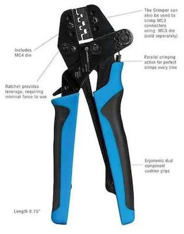 This crimper features the following: Parallel jaws with adjustable pressure-regulating gear and self-locking design crimp solar panel connectors perfectly every time Built-in ratchet makes crimping quick and easy Made of hardened carbon steel with a black oxide finish for strength and durability Dual component grip provides greater comfort and ergonomics Able to crimp MC3 connectors using an MC3 die (SPD-MC3), sold separately