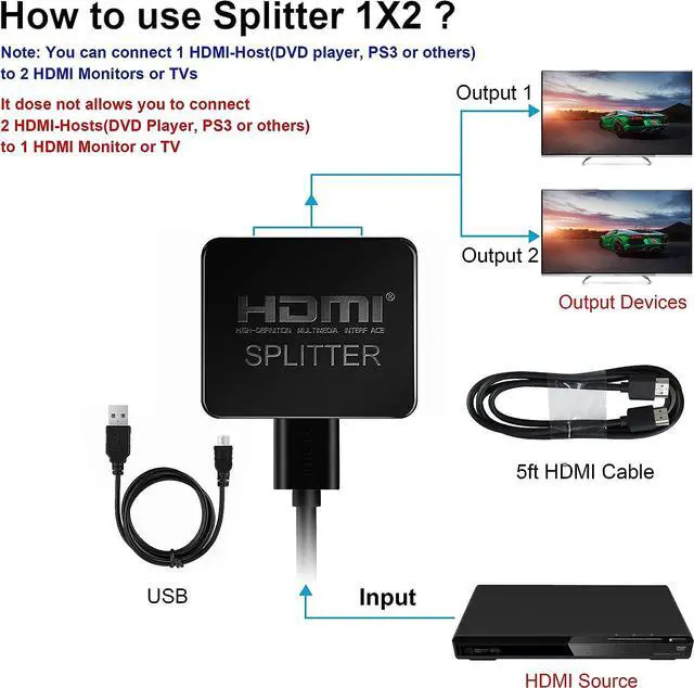 This 4K 1x2 HDMI splitter will coming with usb power cable and High Speed HDM CableI