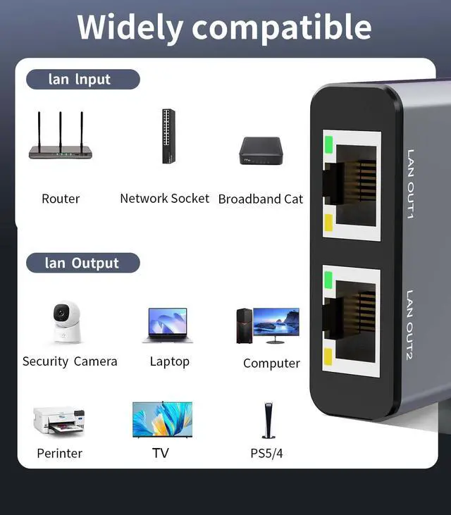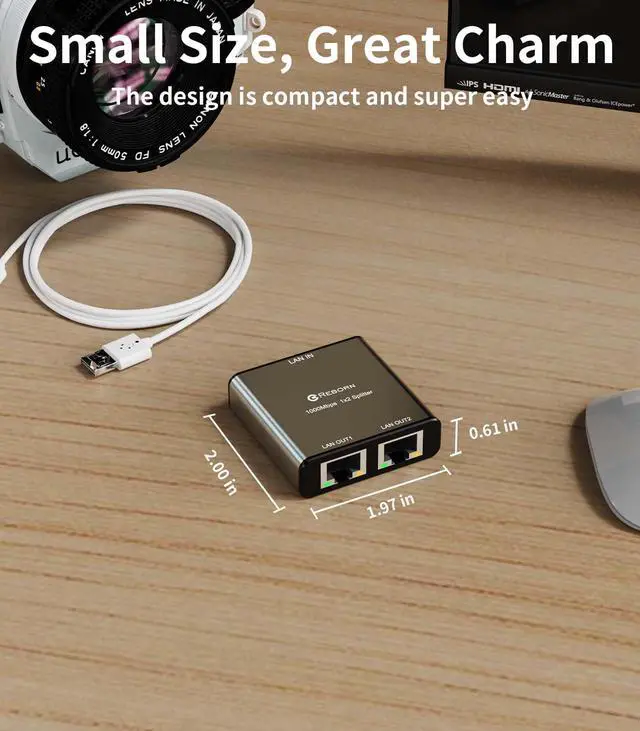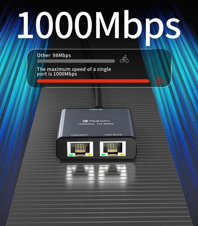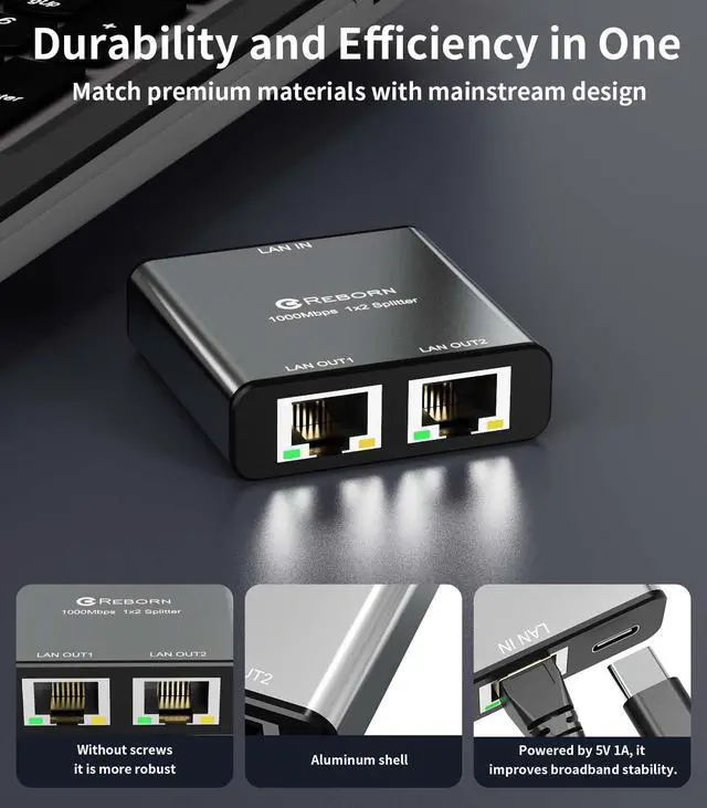Reborn Ethernet splitter 1 to 2. The RJ45 is a gigabit Ethernet port and can provide a maximum data transmission bandwidth of 1000M (total bandwidth). It is backward compatible with 100M/10M (the single-port network speed will decrease when testing multiple ports). Connectors: Input: USB-C, RJ45 Output: RJ45 Specifications: Shape: Small, lightweight, and easy to carry. Installation method: Plug and play, no driver or software required. Gold-plated connector: Optimized performance and corrosion resistance. High-quality aluminum alloy: Excellent heat dissipation effect. Ultra-high speed: Supports up to 1000Mbps transmission rate. Package contents: 1X Ethernet splitter 1 to 2. 1X USB power cable.