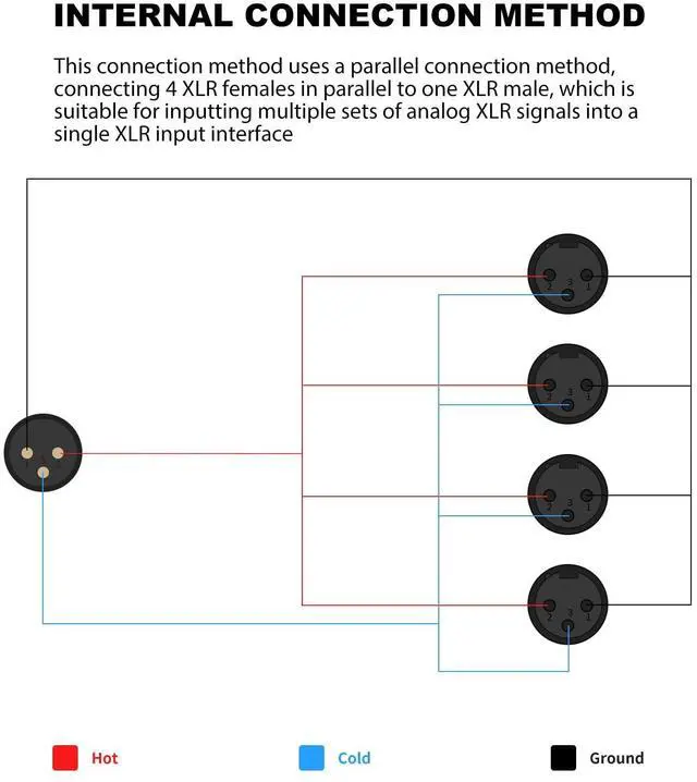 This 4WAY XLR Four-Input and One-Output Parallel Connection Adapter is perfect for connecting multiple microphones, mixers, amplifiers, or audio players to a single input source. Whether you're in a recording studio, live concert, or broadcast setup, this XLR Four Microphone Inputs Converted to One Output adapter simplifies your workflow without compromising audio integrity.