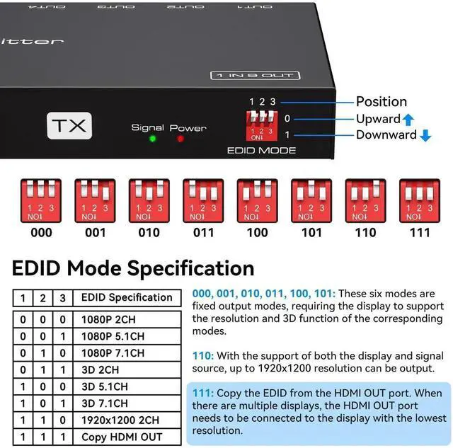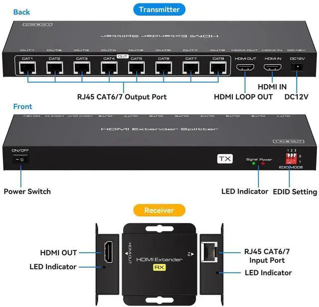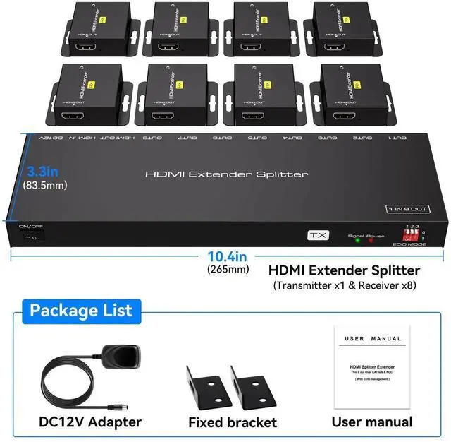[HDMI Extender Splitter 1 Input 8 Output]This HDMI Extender Splitter Over Ethernet can split one signal source into 8 identical signals for video and audio through CAT5e/CAT6 that can transmit up to 165FT (50m) distance. The HDMI extender ethernet has 1 HDMI loop-out, which is a long-distance audio / Ideal for video extender. Note: In order not to affect the video transmission quality, the network cable must comply with the T568B standard line sequence