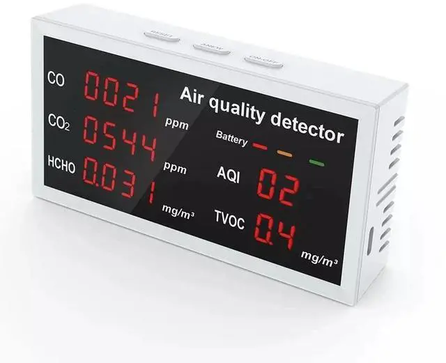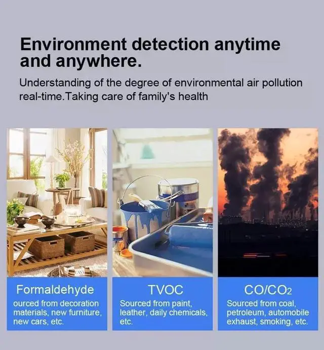 Formaldehyde - ourced from decoration materials, new furniture, new cars, etc. TVOC Sourced from paint, leather, daily chemicals, etc. CO/C02 Sourced from coal, petroleum, automobile exhaust, smoking, etc.