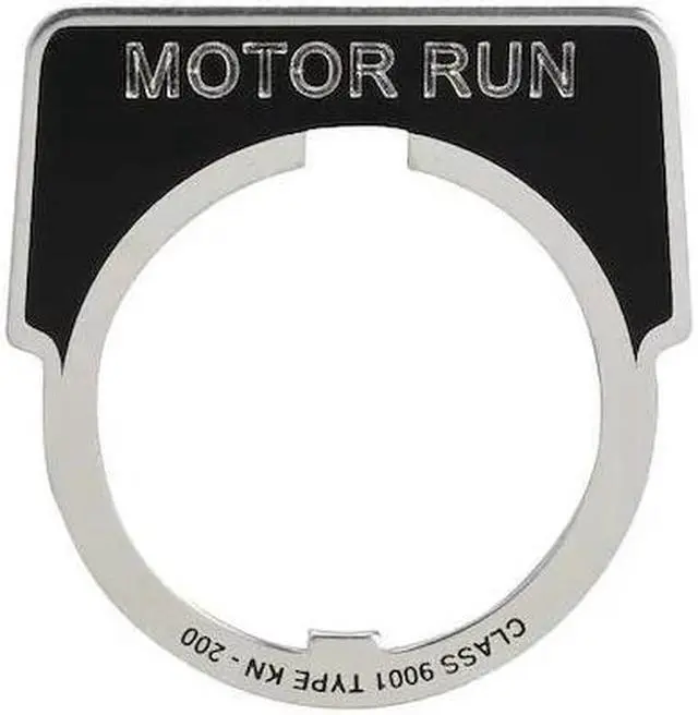 Legend Plate, Half-Round, Legend Motor Run, For Use With 30mm 9001K Operators, Legend/Background Color Black, Material Aluminum, Height 1.9 in, Width 2.3 in