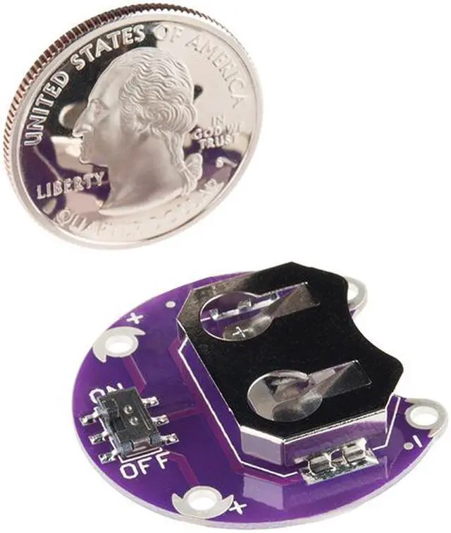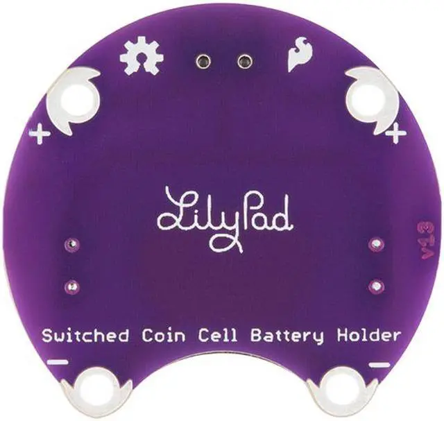 Key Features: Slide switch coin cell battery holder In-Line Power with on/off switch will save your battery Holds a 20mm coin cell battery like a CR2032 (not included) Sure, your flashing, chip-tune playing T-shirt is really cool at the party... but at some point you need to turn it off. And yes, you could just pull the battery, or maybe you' ve even sewn a LilyPad slide switch in-line. Wouldn' t it be nice if there was just a switch *on *the battery? Well, look no further. This LilyPad Coin Cell Battery Holder has a small slide switch installed on the board, in-line with the power so you can shut off your project and save batteries. This slide switch is the same as on the LilyPad Slide Switch Board, so it' s not easy to accidentally turn off or on. Just like the original Coin Cell Battery Holder, this simple board holds a 20mm coin cell battery (such as a CR2032) and gives you four connection points (two positive and two negative) for sewing into your project. Additionally, we have strengthened the battery connector on this board in order to ensure that it doesn' t accidentally pop off.