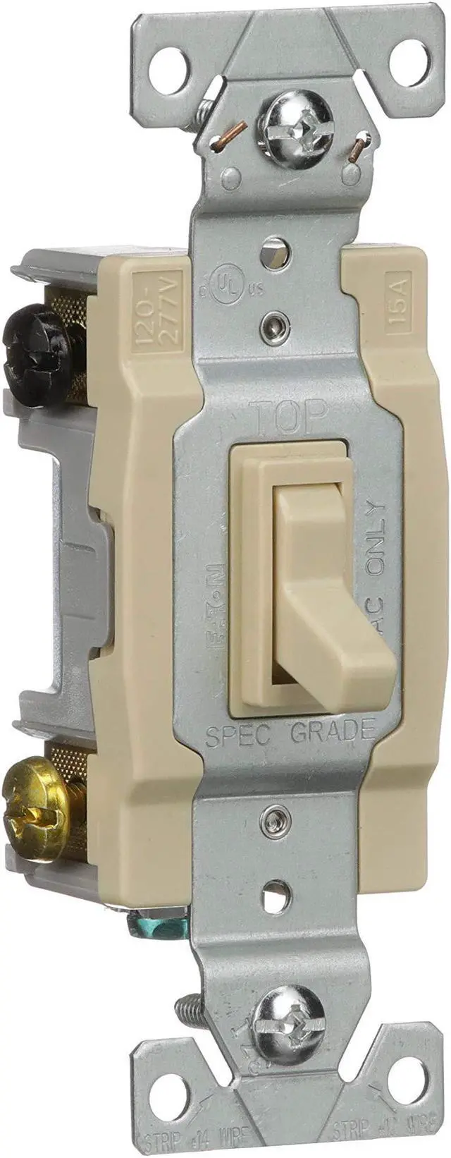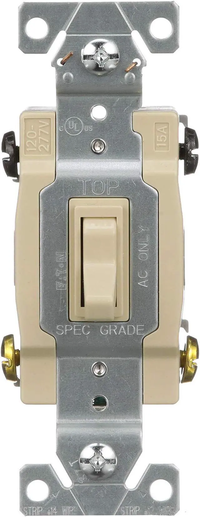 The Eaton 1242-7V-BOX 15-Amp, 120-Volt Standard Grade 4-Way Framed Toggle AC Quiet Switch comes with longer, wider strap on toggle switches provides 40-percent more contact area to wall board. Virtually eliminates floating installations. Industrial design cam action mechanism insures quiet switch action. Patented built-in wire stripper for No.14 and No.12 wire to speed installation. Unbreakable top and bottom housing eliminates call-backs due to job site breakage. Patented built-in wire looper for pre-looping. Three way switches feature additional push-in common termination for feed-through tapping. Push-in terminals accept No.14 solid wire only. Side wire terminals accept up to No.10 solid or stranded wire. 4-Way, side wire and push wire wiring method. NAFTA compliant. Available in ivory color. Measures 1-1/6-Inch length by 1-4/9-Inch width by 3-4/5-Inch height. Whether a home's style is traditional, modern, casual, cozy or rustic, it will demand more from wiring devices than in years past. Eaton is dedicated to providing the up-to-date wiring device solutions; solutions that increase energy efficiency, increase productivity, promote safety at work and in the home, and produce reliable performance. Eaton is a trusted name in electrical products for over 175-years.