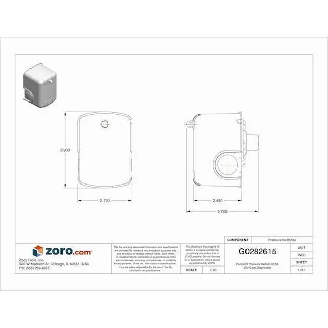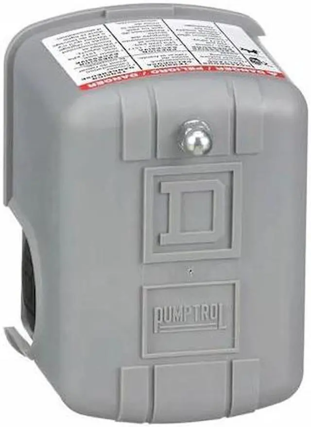Water Pump Switch, Water Pump, Manual Switch Action None, (1) Port, 1/4 in FNPS, Pressure Switch Factory On/Off Setting 20/40 psi, No Pressure Switch Unloader, Pressure Switch Differential 15 to 30 psi, Pressure Switch Range 5 to 65 psi, Pressure Switch Electrical Contact Form DPST, Pressure Switch Action Standard, NEMA Rating 1, Series 9013FS, HP @ 1 Phase - 120V 1 1/2 hp, HP @ 1 Phase - 240V 2 hp, HP @ 3 Phase - 240V 3 hp, HP @ 3 Phase - 480V 1 hp, Temp.