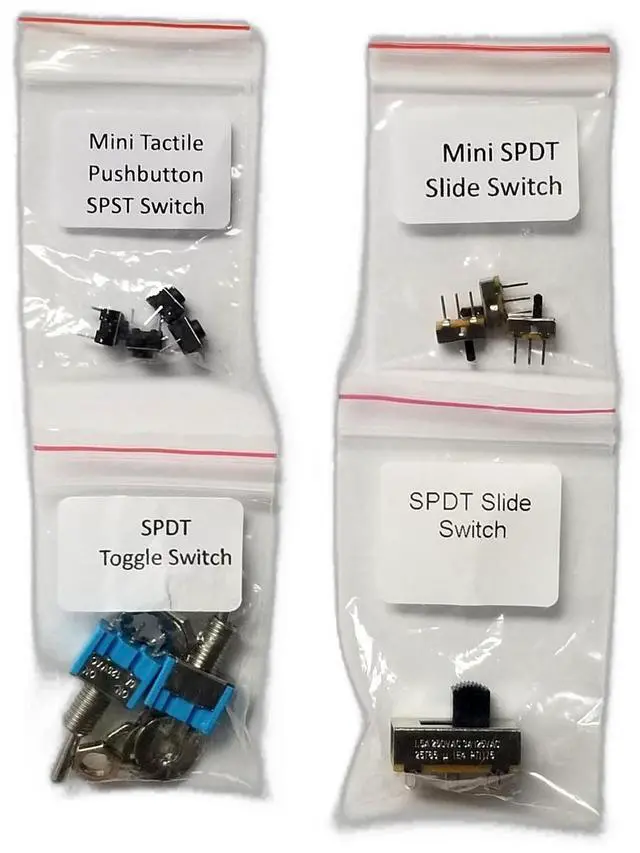 Pc Switches What you get: 4 pcs 3-Pin SPDT Toggle Switch - With screw terminals, this switch is widely used to control operations of many small power electronic projects and can be used on low voltage or high voltage circuits. Ideal for switching lights or motors and DIY projects. 4 pcs 2-Pin Mini Momentary Tactile SPST Push Button Switch - These through-hole switches are suitable for most electronic experiments and are the perfect size for a breadboard. 3 pcs 3-Pin Mini SPDT Slide Switch - Widely used to control operations of many small power electronic projects, including volume and other controls for audio video, dimmer controls for lights, etc., but is not designed to switch significant currents or voltages. Also a great component for DIY. 4 pcs 3-Pin SPDT Slide Switch - This double-throw switch can be used as an on-off switch if you dont attach anything to one of its terminals. You can add an on-off switch to any circuits that you build, so you dont have to unclip alligator wires to disconnect the power.