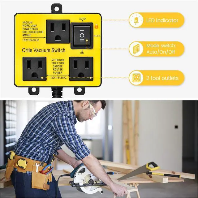 NEW GENERATION-TWO POWER TOOL OUTLETS: The Ortis vacuum switch features two tool outlets, allowing multiple tools to be easily connected without the need for additional power strips. It offers three vacuum operation modes: automatic, off, and on, with auto switching, enabling you to effortlessly save time and effort when starting your tools and vacuum cleaner, so you can focus on more important tasks
