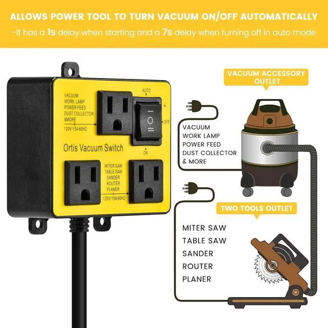 AUTOMATIC DELAY FEATURE: The auto vacuum switch comes with an automatic delay feature, which allows a 1-second delay when start the vacuum and automatically delays vacuum turn off by 7s (in auto mode). This helps prevent circuit overload, reduces dust in the air, keeps your workspace cleaner, and enhances your productivity. It's an essential tool for your woodworking