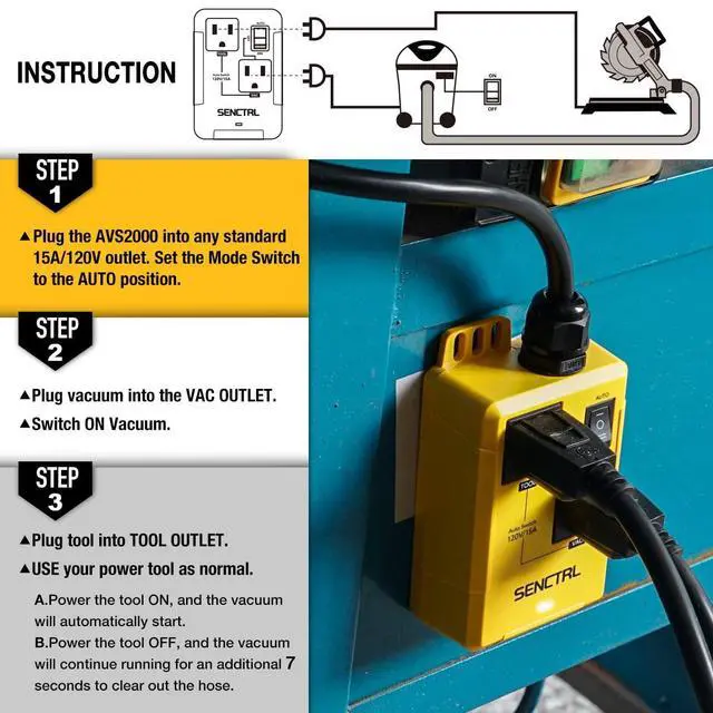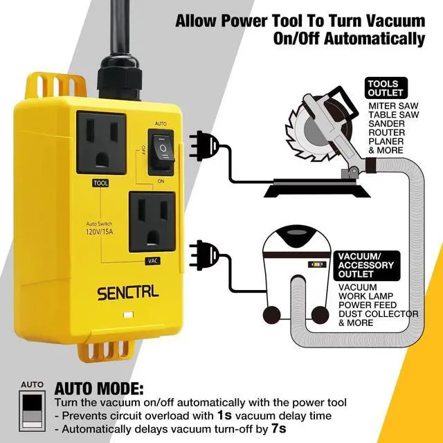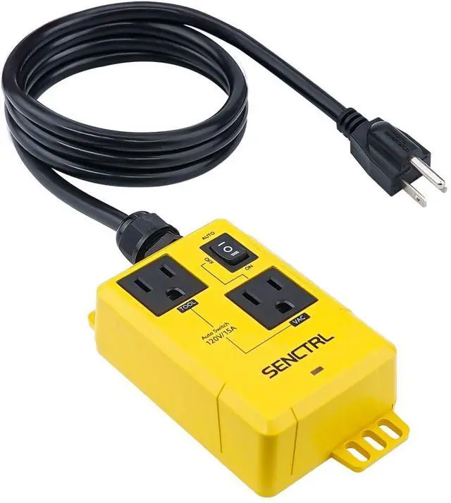 Automatic Vacuum Switch with 5 Ft Power Cord Allow Power Tool/Table Saw To Turn Vac Cleaner/Accessory On And Off Automatically, On Delay Prevent Circuit Overload, Shop Dust Collector Off Delay