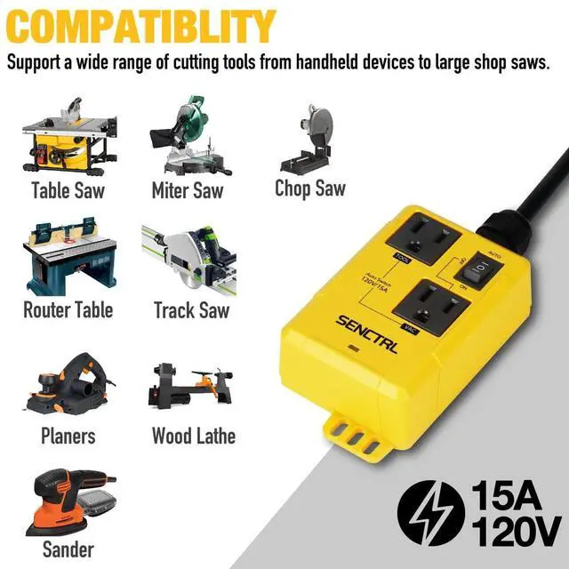 COMPATIBILITY: Support a wide range of cutting tools from handheld devices to large shop saws such as table saw, miter saw, track saw, chop saw, sander, router table, planers, shopvac, remote control outlet, automated vacuum switch, dust collection systems for woodworking and etc. Power rating should not exceed 120 VAC, 15 Amp, 60 Hz, 1875w.