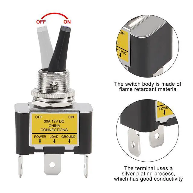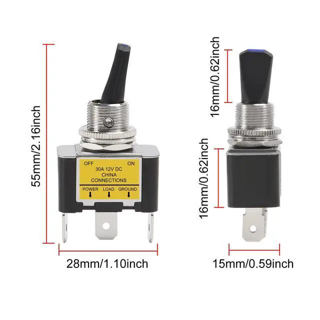 The specification of the LED toggle switch with 3 pins is 30A 12V DC, 2 positions (ON-OFF). SPST design (single pole single throw), simple to use.Mounting hole size is 0.48 inches )12.2MM).