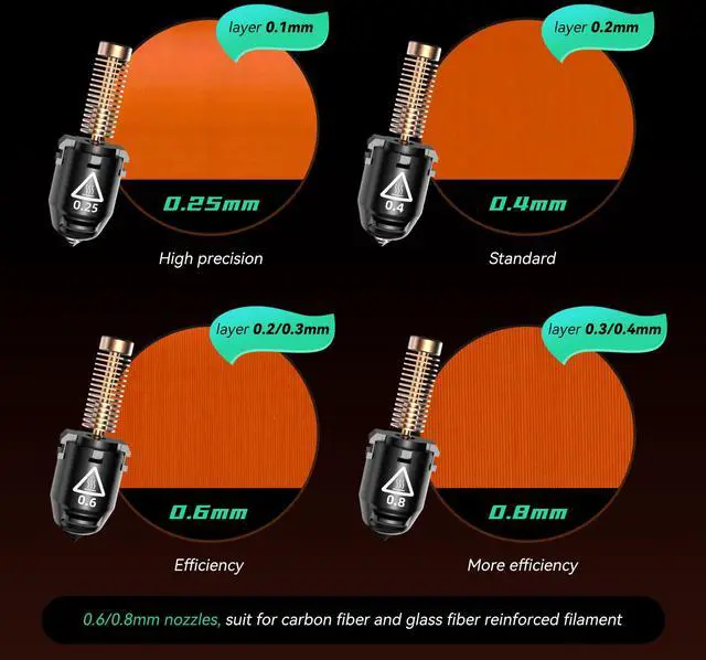 0.6 / 0.8 mm is a high-strength and wear-resistant nozzle, suitable for printing carbon fiber filaments, glass fiber filament, wood filament, PLA galaxy, PLA multicolor, ASA sparkle, PLA sparkle.