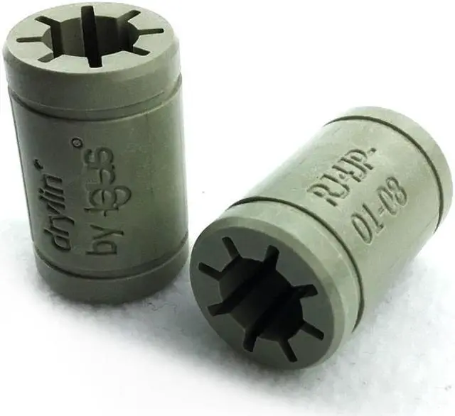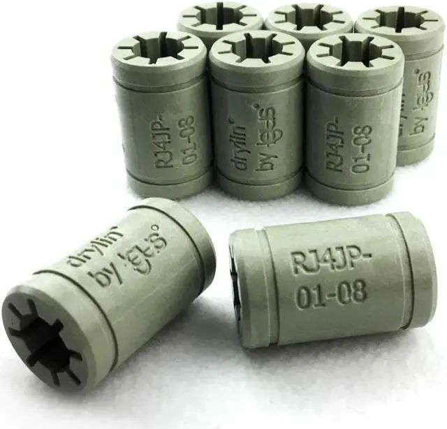 Key Features: Replaces stock LM8UU bearing used in 3D printers 8 mm inner diameter Fits perfectly in 3D printer pillow block 8 pcs per pack and installs easily in x and y axis Self lubricating, not oil or grease needed The lubrication-free drylin (R) linear bearing is based on the principle of "gliding instead of rolling". In combination with corrosion-free materials, tribo-optimised iglidur (R) high performance polymers are used as a sliding surface. drylin (R) linear bearings traverse in dry operation and are thereby maintenance-free and are insensitive to influences such as dirt, water, chemicals, heat or impacts. In addition, they have a very low noise because of the materials used and the special design. With these properties, drylin (R) linear guides can be used in a wide variety of environments, including extreme ones. The modular system allows for high flexibility with different rail guides and pillow blocks. Item Specifics 8 - RJ4JP Linear Bearings