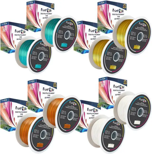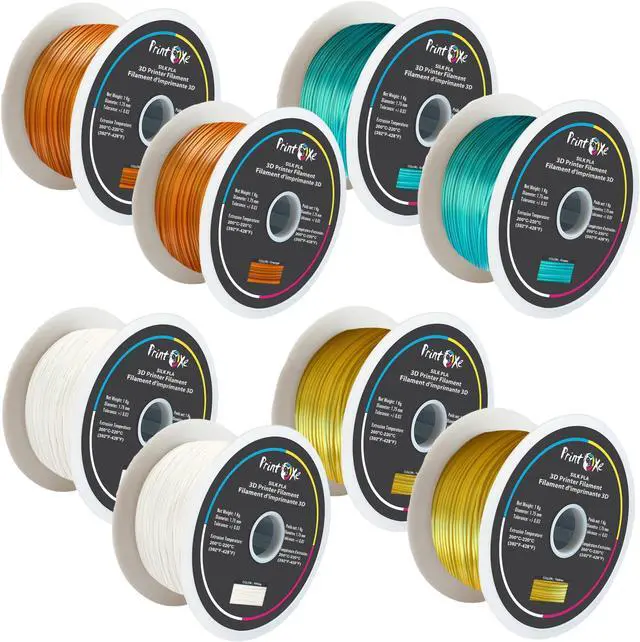 8 Packs of 1st Grade PLA like SILK Filament for 3D Printers. 2 White, 2 Orange, 2 Yellow & 2 Green Colours, 1.75 mm Diameter. Net Material Weight on Each Spool is 1 Kg ( 2.2 Lbs), a Total of 8 Kg ( 17.6 Lbs) Net. High-gloss Formula with Outstanding Smooth Shiny Surface Finish Prints.