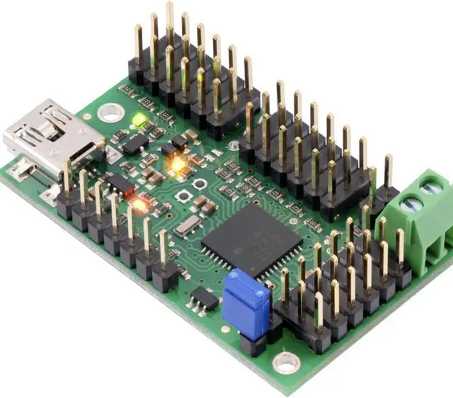 The Mini Maestros are the newest of Pololu' s second-generation USB servo controllers, offering more channels and features than the smaller six-channel Micro Maestro. The 18-channel Mini Maestro 18 raises the performance bar for serial servo controllers with features such as a native USB interface and internal scripting control. Whether you want the best servo control available ( 0.25 μ s resolution with built-in speed and acceleration control and pulse rates up to 333 Hz) or a general I/O controller (e. g. to interface with a sensor or ESC via your USB port), this compact, versatile device will deliver.