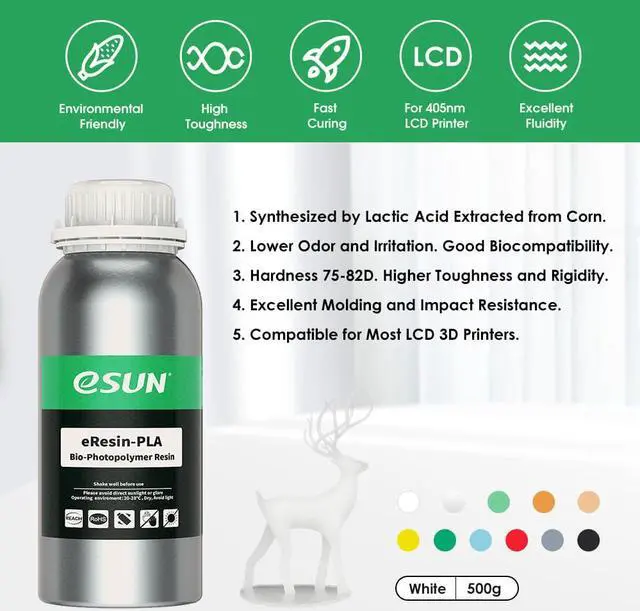 • Professional LCD Molding ResinSpecially designed for LED light source. eSUN Plant-Based Resin is compatible for most of LCD 3D printers for fast prototyping with art &craft, home decoration, toys, garden tools and jewelry making.