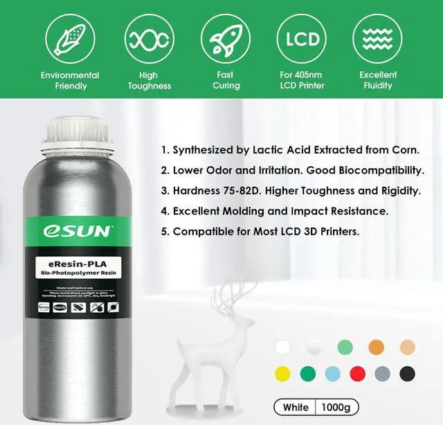 • Professional LCD Molding ResinSpecially designed for LED light source. eSUN Plant-Based Resin is compatible for most of LCD 3D printers for fast prototyping with art &craft, home decoration, toys, garden tools and jewelry making.